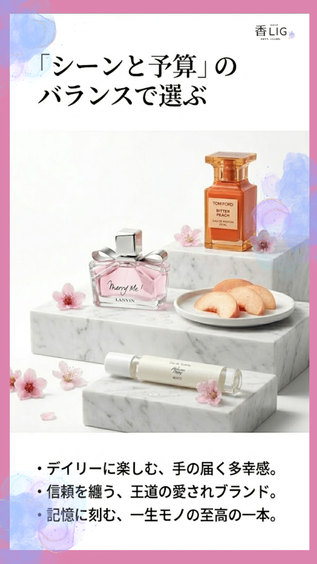 予算とシーンの組み合わせで、桃の香水は大きく3つの層に分かれます。